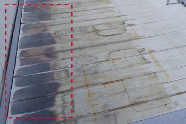 表面の塩ビ鋼板は紫外線などの影響で鋼板にコーティングされている塩化ビニルが劣化し、進行すると鋼板に錆や穴が生じ雨漏れに繋がる恐れがあります。下のルーフィングも熱や湿度で劣化し、ビス廻りや床材の継ぎ目に隙間ができると漏水につながる可能性があります。