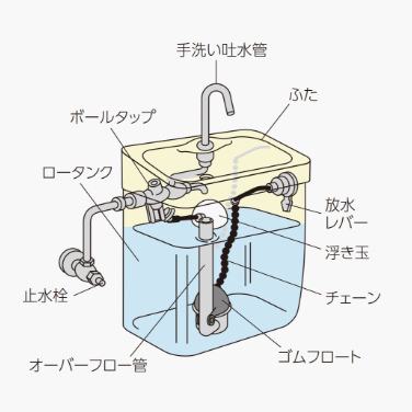 | 浮き玉がはずれている | 固定ナットをしめて、浮き玉をボールタップに取りつけます。 |