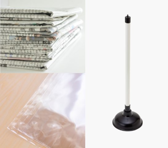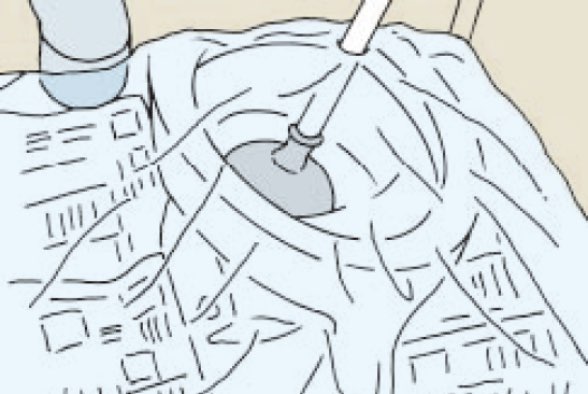 1床に新聞紙を敷き、ラバーカップを当てた上から水がはねないようにビニールで覆います。
