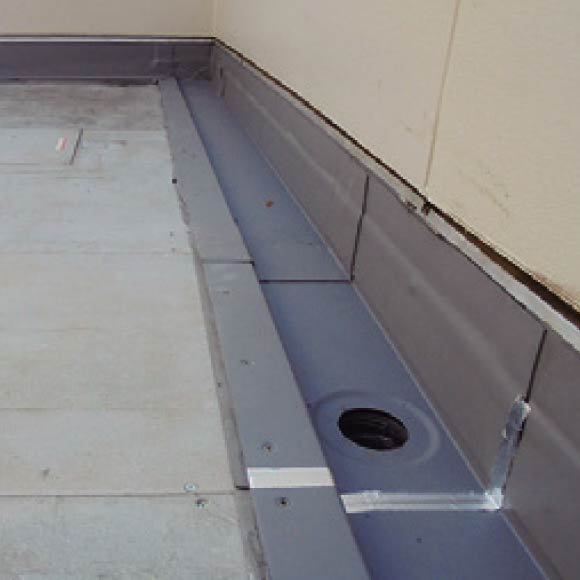 床部分は、防水のため仕上げ材の下にDNシート(塩ビシート)を使用。樋まわりなどの複雑な部分にはDN鋼板(塩ビ鋼板)を用いています。