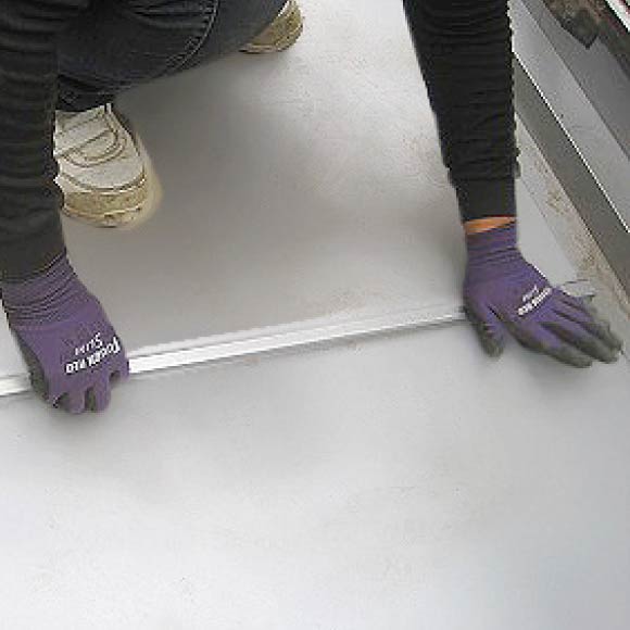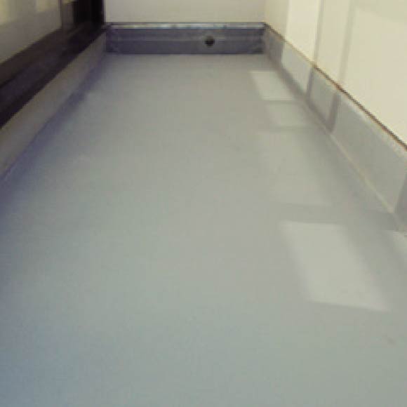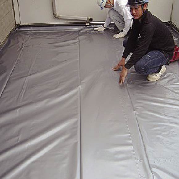 床面は、仕上げ材の下に「塩ビ鋼板」という床板があり、その下に勾配屋根の2次防水として使われているのと同じ「ルーフィング」を使用し、防水しています。