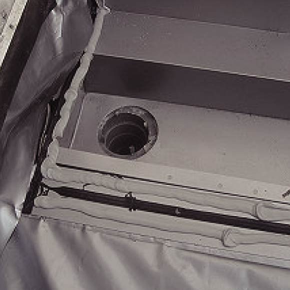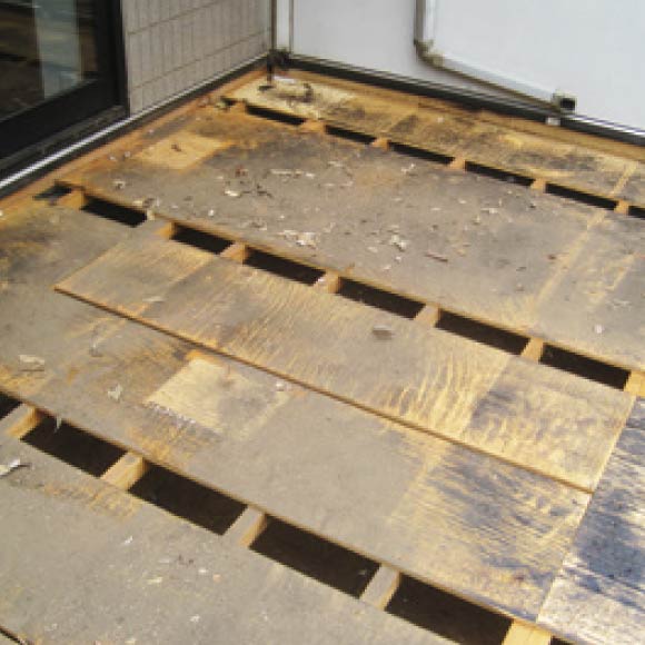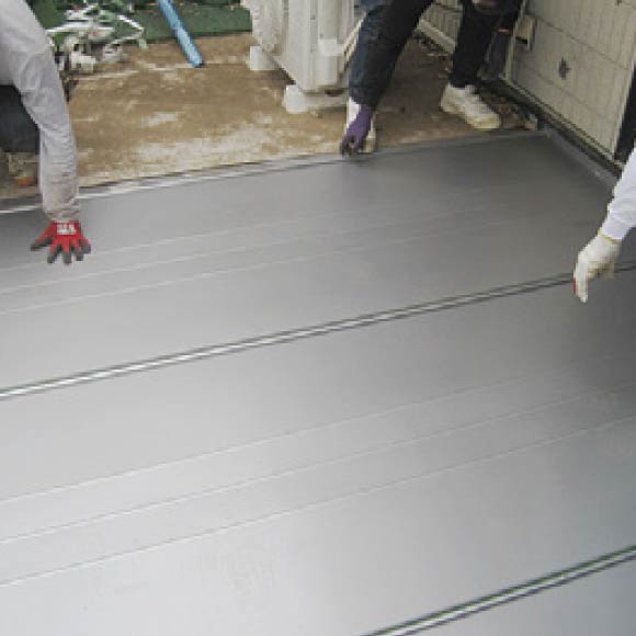 床面にはDNシート、樋まわりなどには塩ビ鋼板を使用。紫外線などの影響で、シートが硬化すると床材が引っ張られて浮き上がる「たわみ」が生じ、放置するとひび割れや亀裂が進行し、雨漏れにつながることもあります。