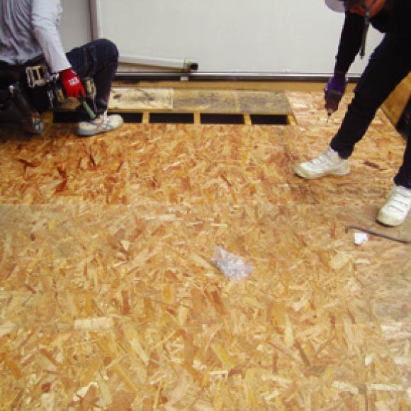 既設の床下地材を撤去し、新しい床下地材を取り付け