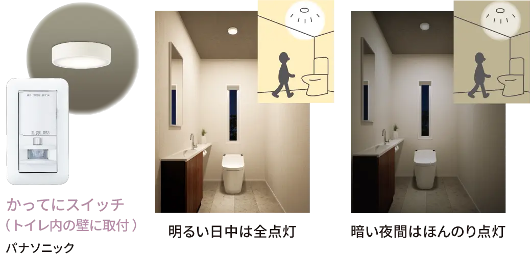 夜中トイレに起きたとき、照明がまぶしくてすっかり目が覚めてしまう。そんな不快を軽減する「ほんのり点灯モード」付の照明とスイッチの組合せ。人感センサーでON/OFFするので、スイッチの操作も不要です。